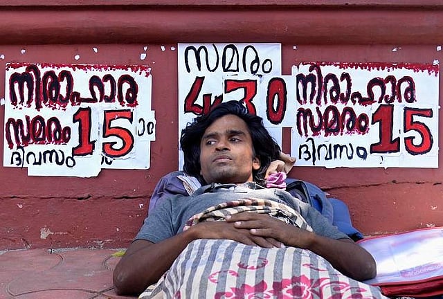On other days, Sreejith would wait for his mother to visit him with some food to fill his belly. But ever since he began his hunger strike, he has chosen to lie down and stare at the vehicles and many faces that go past him.
