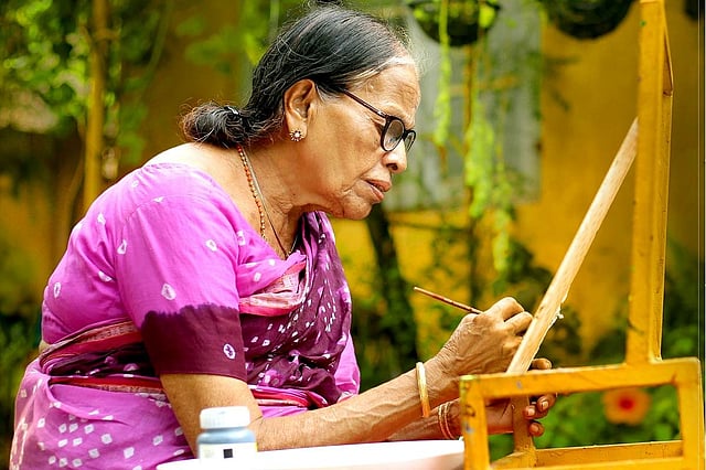 Last July, PS Padmini was walking between the paintings that she brought to the Museum hall in Thiruvananthapuram for her fourth art exhibition in nine years. Then 82, Padmini had endeared herself to the visitors with the excitement of a child while she spoke of her paintings and crafts. Now a year older, Padmini, with the help of her children, is having a virtual exhibition of 165 of her artworks. Not just to exhibit to the world but to use the money from selling the work to build a house for an underprivileged girl in Thiruvananthapuram.
