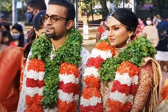 The wedding this time around was at a much smaller scale due to the pandemic. Actor Mohanlal and his wife Suchitra attend the wedding at Guruvayoor.
