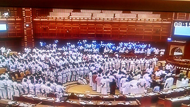 The News Minute | March 13, 2015 | 09.00 am ISTKerala Finance Minister KM Mani has successfully entered the Kerala Assembly on his third attempt on Friday amid protests from the opposition. The Left had declared that they would not let the Finance Minister accused of taking bribes from bar owners present the budget.When he initially attempted to enter with marshals, senior MLAs belonging to the Left stood in front of him and pushed him out. Even the new speaker N Shakthan was not allowed to enter the premises. On his third attempt, at 9 am, he entered the House flanked by his MLAs. But Mani did not approach his seat to present the budget, but instead began reading out the budget using a microphone attached to his shirt. During this time, the Speaker was not in the Assembly.The Speaker who sat in his chamber gave permission to Mani to place the budget. He then read out the introduction to the budget and placed it before the Assembly. Then, one MLA approached Mani and gave him a peck on his cheek as a sign of appreciation.Though Left MLAs tried their level best to reach KM Mani and stop him from reading the budget, a thick blanket of security prevented them from doing so.Earlier ahead of the budget, the assembly witnessed chaotic scenes as opposition members threw out the Speaker’s chair along with his computer out of the dais. Two opposition MLAs fainted in the Assembly. A total of nine opposition MLAs were reportedly injured in the fracas.Meanwhile, scenes of chaos played out outside the assembly as DYFI (CPIM Labour union) and BJP Yuva Morcha cadres tried to lay siege to the assembly. There were sporadic incidents of violence and stone-pelting.(Image courtesy: Asianet)TweetFollow @thenewsminute