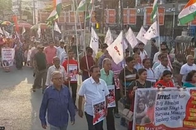 Scores of CPI(M) (Communist Party of India, Marxist) workers took out a protest rally in Agartala on Thursday, May 18, to express their solidarity with wrestlers who are sitting on a dharna at the Jantar Mantar in the national capital for the past 26 days seeking action against Wrestling Federation of India (WFI) chief Brij Bhushan Sharan Singh, whom they have accused of sexual harassment. The CPI(M), led by former minister and senior left leaders Pabitra Kar and Samar Chakraborty, demanded the arrest of the WFI chief.
