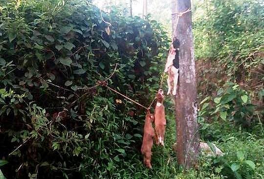 The carcasses of three dogs were found hanging from an electric post in a village in Kannur on a day that marks the first death anniversary of RSS leader Kathiroor Manoj who was hacked to death on September 1, 2014.
