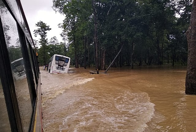 A Karnataka State Road Transport Corporation (KSRTC) inter-state bus plying between Karnataka and Kerala was stranded on a flooded road in Wayanad on Wednesday, due to the heavy rains. The bus that started service from Kozhikode to Bengaluru on Tuesday night, broke down in Sulthan Bathery, after which, the passengers were put on another bus and the journey resumed later.
