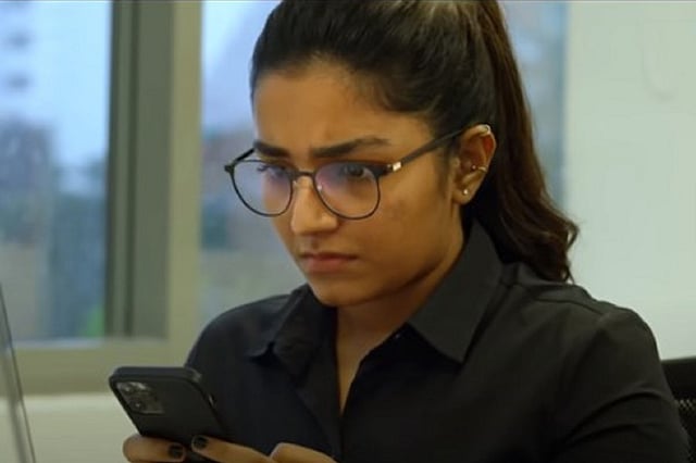 The film drives straight to the point – the endless bullying a woman can face once her phone number is leaked. However, the victim Radhika (played by Rajisha), has the advantage of working in this area – her company deals with cyber security, and she helps the police.
