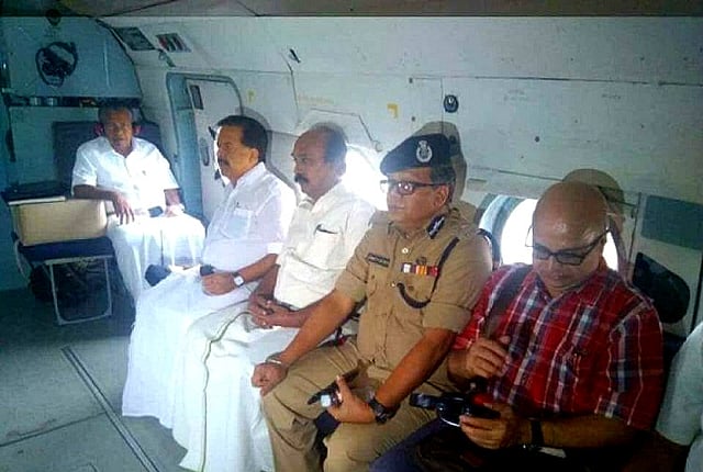 Kerala Chief Minister Pinarayi Vijayan on Saturday took stock of the situation in the state which is reeling under heavy flooding and rains this past week. In a rare incidence however, it was the Leader of Opposition, Congress leader Ramesh Chennithala, who accompanied Pinarayi on his aerial survey along with Chief Secretary Tom Jose and Kerala Police Chief Loknath Behra.
