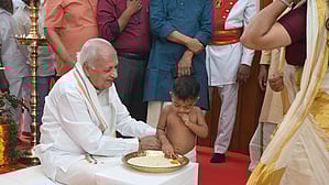 On Tuesday, among those who turned up to take the role of teachers included master filmmaker Adoor Gopalakrishnan, vice chancellors, senior temple priests. Using a gold ring the 'teacher' writes a Malayalam word on the tongue of the child. While the Hindu children write 'Hari Sree Ganapathaye Namaha', Christian's write 'Sree Yesu Mishihaye Namaha'.