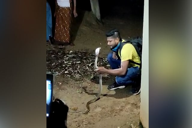 A 30-year-old Kerala man hailing from Sasthavattom in Thiruvananthapuram died on Sunday night after being bitten by a snake which he had rescued and had been exhibiting in front of people. The death has garnered attention as visuals of the incident came out.