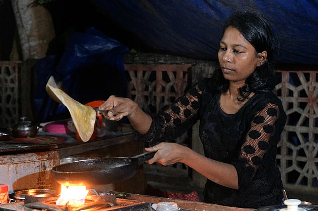 Alone, she ties up the tarpaulin sheets, connects the battery bulbs, arranges the benches, stove and gas cylinders. She gets ready to serve customers hot aloo parathas which have become popular for their ginger-garlic-coriander flavour.