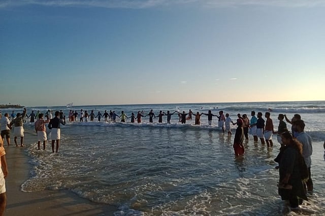 Around 3000 people from Alappad village of Kollam district have been on a relay hunger strike for the last one year against mineral beach sand mining in the coastal area. On the first anniversary of the strike, the protestors formed a human chain ‘Sagara Shayanam’, on the beach near Vellanathuruthu in Alappad on Friday. Magsaysay awardee Sandeep Pandey and environmental activist CR Neelakantan joined the protesters. The protesters had also held a coastal march on Thursday.