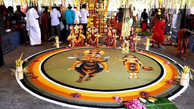 But in Peringottukara, the legend differs slightly. Shiva was attracted to a Pulaya woman but she was hesitant to consummate the relationship, so she asked Parvathy for help. Parvathy then disguised herself as the Pulaya woman and after obtaining Shiva’s semen poured it into a wild fruit and gifted it to the Pulaya woman. The fruit later turned into the child Chaathan and took the avatar of Vishnu to visit his father at Mount Kailasam.
