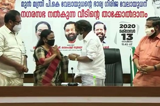 Late Congress leader and former Kerala Minister PK Velayudhan’s wife Girija Velayudhan on Tuesday received keys to the apartment which the state government constructed for the family under the Life Mission project, LDF government’s housing project for the homeless. Girija who had been struggling to construct a house after the death of the former Minister had approached the CPI(M) led-LDF government seeking help.