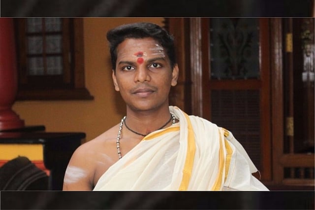 Now he is a final-year post-graduate student in Sanskrit at Vidwatpeedom Kodungallur, and a student of Sree Gurudeva Vaidika Thanthra Vidyapeedom in North Paravur. He joined the weekly classes of the Vidyapeedom when he was studying in Class 7. Hailing from Nalukettu in Thrissur, he used to commute to North Paravur - about 50kms away - on weekends to learn to serve god.