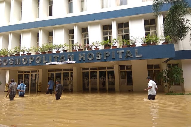 One floor of the Cosmopolitan Hospital in Thiruvananthapuram has been flooded due to incessant rains in the district, and several vehicles that were parked in the premises of the hospital are now under water. The management of the popular private hospital says they have made arrangements to keep it running.