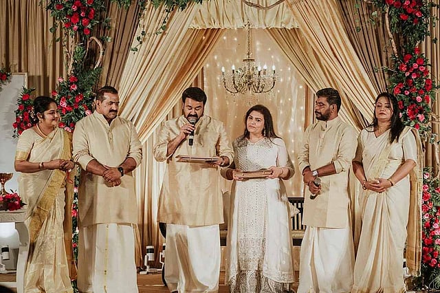 Dressed in beige silk kurta and vesti, actor Mohanlal addressed the small gathering and greeted the couple, along with his wife Suchitra, who wore a simple yet elegant white kurti and skirt.