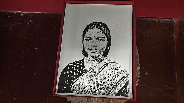 That was when the Hema Committee report was released—what Vali calls the starting point of many conversations around abuse. While the report and the WCC feature prominently, a central theme of the exhibition winds around PK Rosy, the first heroine of Malayalam cinema, who was chased away for playing a privileged caste Nair woman while being a Dalit. Aleena’s poem is an extension of the theme, leading from an exhibit containing 56 photos of Rosy—the same single photo of hers, repeated over and over again, “to resist her erasure.”