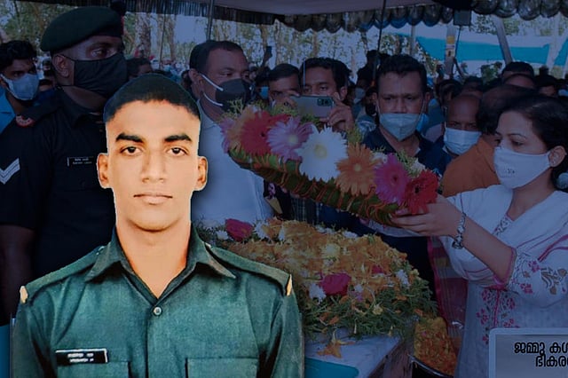 Kerala Finance Minister KN Balagopal, who was representing the state government, Mavelikkara MP Kodikunnil Suresh and state Animal Husbandry Minister J Chinchu Rani and several senior government and army officials were also present at the slain soldier's home to pay their last respects.