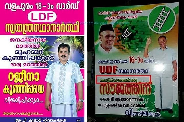 An independent candidate backed by the Left Democratic Front too was nowhere to be seen on posters meant for her. Rajina Kunjippa's campaign posters had the picture of her husband Madathil Kunjippa, the local leader of Valapuram, Malappuram.