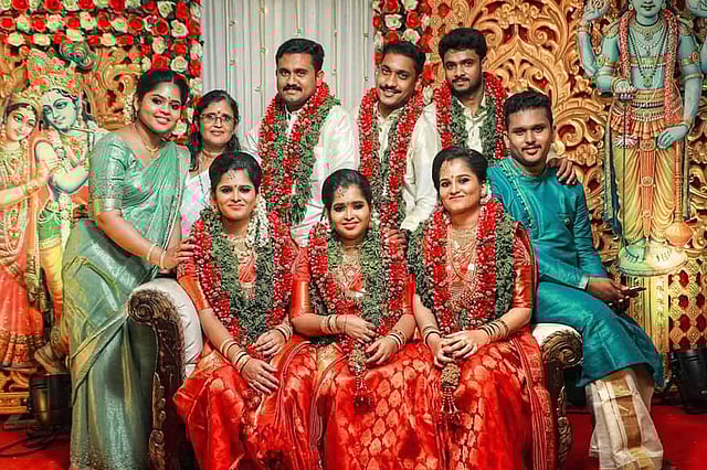 Rema Devi, a single mother from Thiruvananthapuram’s Pothencode, was elated as three among her quintuplets got married in Guruvayur on Saturday, says her daughter. Clad in red Kanchipuram silk sarees and similar gold ornaments, her three daughters had a small wedding following all COVID-19 protocols.
