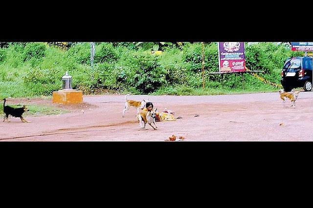 The caption of the photograph reads: “A housewife in Mannarkad being attacked by stray dogs near Arakkurushi temple. Locals who rushed to the spot hearing her screams rescued her. Close to 8-10 stray dogs are present in this road at all times. Not only children, but elders are also scared of walking on the road.”
