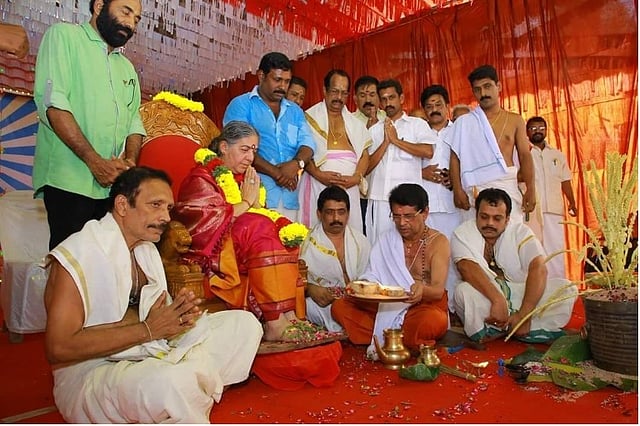 This year’s Naari Puja ceremony was inaugurated by eminent Indian scholar and environmental activist Vandana Shiva. Vandana, clad in shades of pink and orange, lighted the inaugural lamp, and was then seated on the special peetom and garlanded. The chief priest began the ritual by washing her feet.