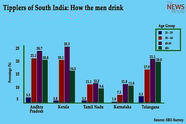 Data shows that across the southern states, men in the middle-age bracket of 45-59 are the biggest tipplers. The influence of alcohol amongst youngsters across the five South Indian states is limited. The youth between the ages of 15 to 29 consume less alcohol compared to other age groups. At 5.5 per cent youngsters in Andhra Pradesh consume the most alcohol compared to other South Indian states. Neighbouring Telangana comes next with 5.1 per cent.