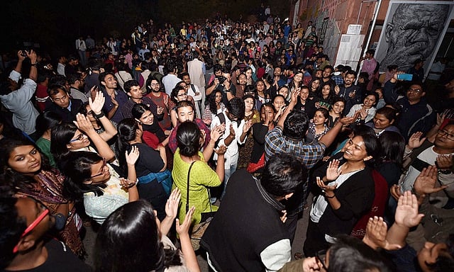 The beating of the traditional JNU daflis with flags of different student organisations being raised marked the happiness and pride of the protesters who had marched to the Parliament from Mandi House on Wednesday afternoon and waited there for 4 hours for the Delhi High Court to announce its verdict.