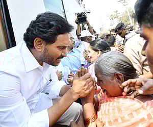 With a bandage over his left eyebrow, the YSR Congress Party (YSRCP) chief was seen sitting in the bus, waving at the people who had gathered in large numbers along the yatra route to welcome him.
