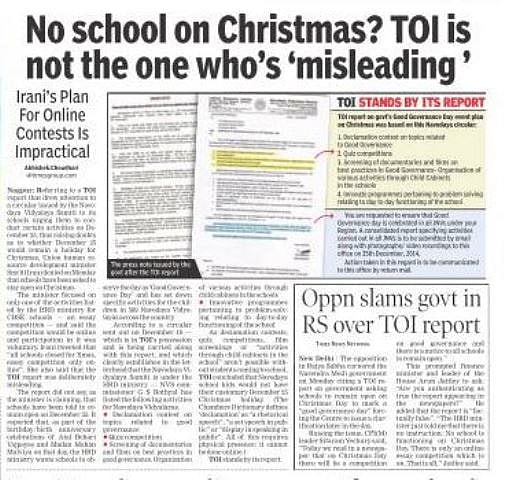 In a report headlined “No school in Christmas? TOI not doing the ‘misleading’”, the reporter Abhishek Choudhari countered the allegations made by Irani and attempted to set the record straight. The reporter finished with: “The TOI report, as can be seen, was factual. TOI is not doing the "misleading".”