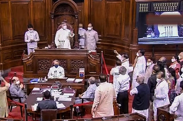 The opposition forced three adjournments of the Upper House within an hour on Monday after the eight Rajya Sabha members were suspended, including because of the MPs’ refusal to leave the House.