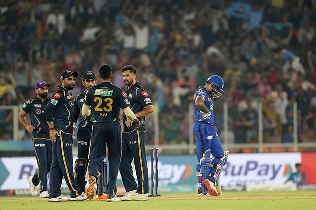 He welcomed Mohit Sharma with a pulled six, but the pacer bounced back immediately as Suryakumar went for another scoop, and saw his leg-stump castled. Concussion substitute Vishnu Vinod also fell to Mohit after spooning a catch to cover, followed by Tim David trapped lbw by Rashid. Mohit took the remaining three wickets to clinch a five-wicket haul in just 14 balls, thus sealing Gujarat's place in the final.