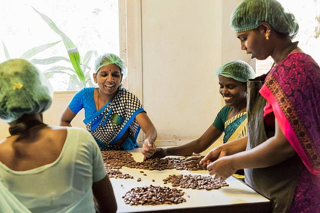 Mason & Co. founded by Jane Mason and Fabien Bontems, which functions from Auroville, Puducherry, also makes chocolate with lower carbon footprints. Saraswathi Murthy has been working at the factory since 2013 when she was first spotted by the founders and currently manages the running of the plant. All the 17 women employed for chocolate making have been trained by her.