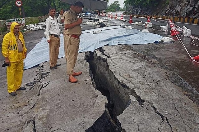 A major crack on the road halted traffic on the Mumbai-Nashik highway in Maharashtra's Kasara Ghat. The crack developed on Monday night after heavy rainfall. Pictures of the cracked road were circulated on social media. The photographs are from Kasara Ghat in Maharashtra. Officials are currently carrying out repair works. Earlier, KSRTC officials had told TNM and multiple other news outlets that the picture was from Karnataka-Maharashtra border. However, this article has been updated after a clarification from the Maharashtra State Highway police on Tuesday evening.
