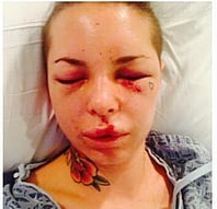 about 2 am Friday morning, Jon Koppenhaver arrived unannounced to my home in Las Vegas, NV, after he broke up with me in May, he moved out of my house and back to San Diego. When he arrived, he found myself and one other fully clothed and unarmed in the house. Without a single word spoken, he began beating my friend; once he was finished, he sent my friend away and turned his attention to me. He made me undress and shower in front of him, then dragged me out and beat my face. I have no recollection of how many times I was hit, I just know my injuries that resulted from my beating. My injuries include 18 broken bones around my eyes, my nose is broken in 2 places, I am missing teeth and several more are broken. I am unable to chew, or see out of my left eye. My speach is slurred from my swelling and lack of teeth. I have a fractured rib and severely ruptured liver from a kick to my side. My leg is so badly injured I have not been able to walk on my own. I also attained several lesions from a knife he got from my kitchen. He pushed the knife into me in some areas such as my hand, ear, and head. He also sawed much of my hair off with this dull knife.