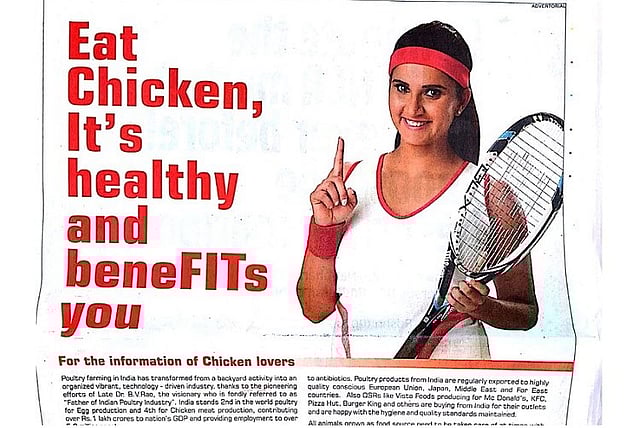 On February 27, 2018, a full-page advertorial appeared in Times of India, featuring ace tennis player Sania Mirza. The ad read, “Eat chicken, it’s healthy and beneFITs you.”