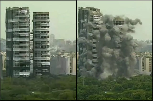 The Supertech twin towers in Noida were demolished on Sunday, August 28, a year after the Supreme Court's direction to raze the illegally built structures to the ground. The Apex (32 floors) and Ceyane (29 floors) towers were under construction since 2009 within the Supertech Emerald Court housing society in Sector 93A of Noida, adjoining the national capital of Delhi. They were the tallest structures to be demolished in India. An official of Edifice Engineering, the company which was tasked with the demolition, said there was no damage to the residential towers in the adjoining Emerald Court society. The nearly 100-metre-high structures were taller than Delhi's iconic Qutub Minar (73 metres).