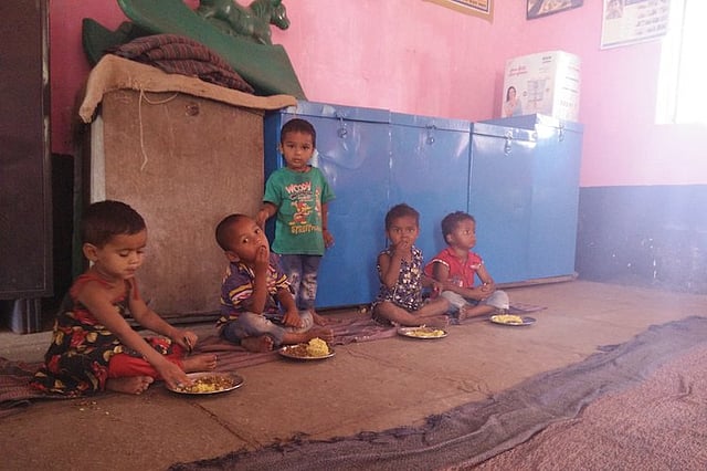 One angnwadi worker clips a child’s nails while another watches the children eat lunch.