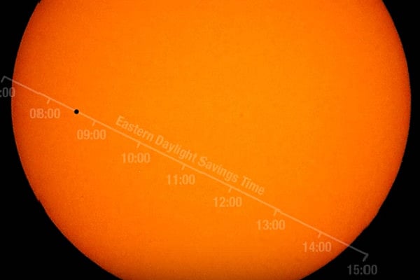 According to NASA, "Mercury will appear as a small black dot as it crosses the edge of the sun and into view at 7:12 a.m. The planet will make a leisurely journey across the face of the sun, reaching mid-point at approximately 10:47 a.m., and exiting the golden disk at 2:42 p.m. The entire 7.5-hour path across the sun will be visible across the Eastern United States – with magnification and proper solar filters – while those in the West can observe the transit in progress after sunrise."