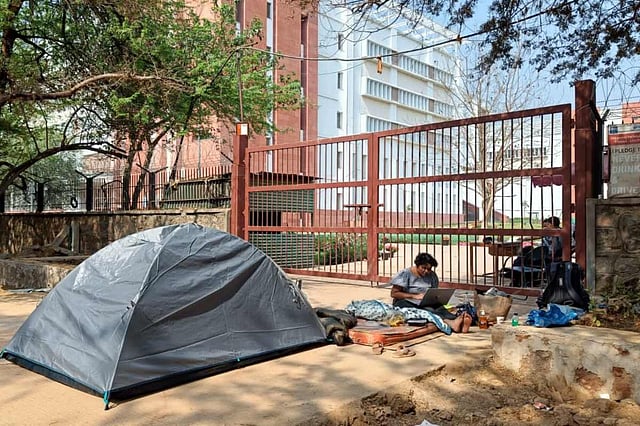 Seeking shelter under a camping tent, 27-year-old Apoorva YK, a final year LLM (Masters of Law) student of the South Asian University (SAU) in Delhi, is on an indefinite sit-in protest outside the University gate against her expulsion. She, along with Procheta M, an MPhil scholar in Sociology, was expelled on February 18, two months after a student movement demanding a hike in scholarships and stipends for students ended. Two students were rusticated for a year, and another was charged with a heavy fine, on the same day. Students allege that the University administration has been hounding them arbitrarily ever since October 2022, when the protests first began. Apoorva is determined to continue with the protest until the administration revokes the expulsion and rustication of all the students who have been allegedly targeted by the University.
