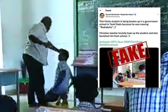 Hindi news channel Sudarshan News on Sunday shared a video clip of a student being beaten up in a classroom with the claim that he was beaten up by his ‘Christian teacher’ for wearing a ‘rudraksha’ (Hindu prayer beads). The editor-in-chief of Sudarshan News Suresh Chavhanke also tweeted a misleading claim, saying, “This Hindu student is being beaten up in a government school in Tamil Nadu because he was wearing “Rudraksha”..!! Christian teacher brutally beat up the student and also banished him from school..!!” However, this claim is fake and misleading, as the details from a different incident have been shared with a video from a separate incident.