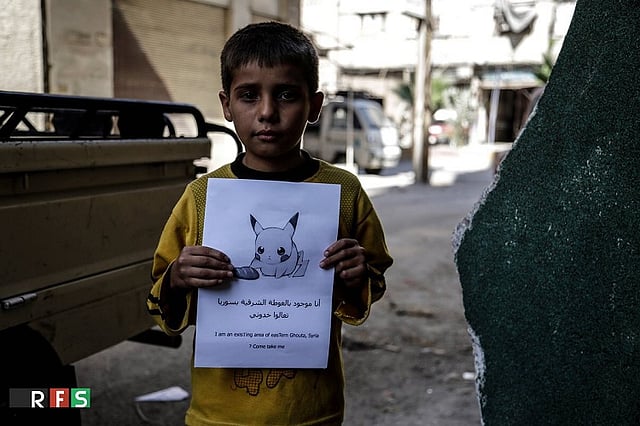 In a series of messages tweeted by the Revolutionary Forces of Syria, Syrian children are holding up pictures of Pokemon with messages asking people to find them and take them away from the war-torn country.