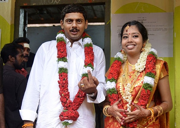As the day wore on, journalists scrambled to photograph couples who turned up in their wedding finery, and who were flaunted the indelible violet ink with equal pride. Images from across Tamil Nadu and Kerala