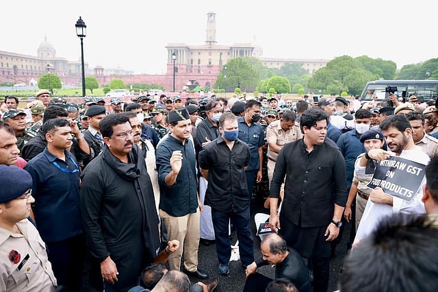 Wearing black clothes, Congress leaders hit the streets on Friday to protest against price rise and unemployment with a host of them, including Rahul Gandhi and Priyanka Gandhi Vadra, being detained by police amid dramatic standoffs outside Parliament and the AICC headquarters here. Congress MPs, including former party chief Rahul Gandhi, staged a protest in the Parliament House complex and then proceeded to take out a march towards the Rashtrapati Bhawan as part of the party's nationwide stir against price rise, the Goods and Services Tax (GST) hike on essential items and unemployment.