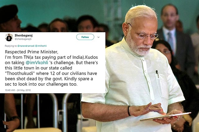 Look at d misplaced&inverted priorities of d regime! While #Thoothukudi has witnessed one of d most barbaric forms of violence by d state brazenly appearing on d side of crony capitalists, our @narendramodi ji is accepting fitness challenge frm @imVkohli
