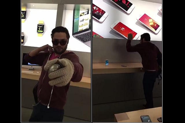 What followed after was as bizarre as it was disturbing. This video footage, captured by a customer in the store, shows him methodically removing iPhones from their holders, laying them flat on the table before bringing the steel ball smashing down on their displays.