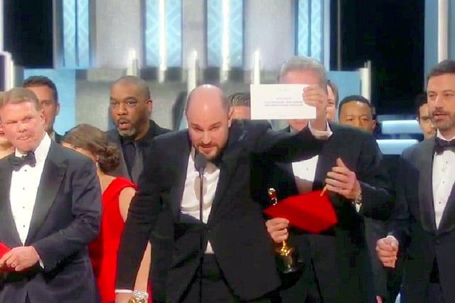 Moment when crew and cast of 'La La Land' realizes a mistake had been made and 'Moonlight' won Best Picture. #Oscar pic.twitter.com/BLKCLrMEso