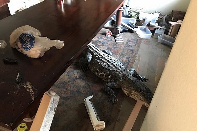 One Texan came back to his house after hurricane Harvey to find an unwelcome guest beneath his dining table – a nine-foot long alligator.