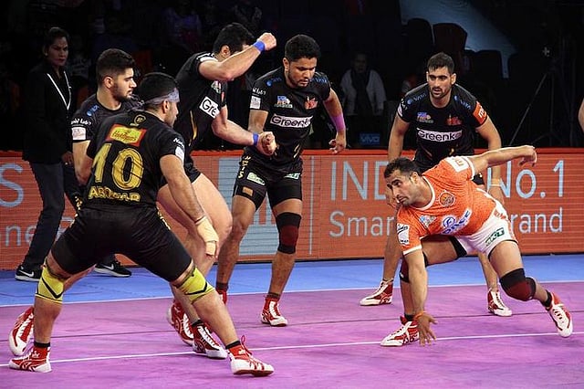 Telugu Titans tackled Rajesh Mondal to open their account before their successful attempts saw them take a 5-1 lead in the first five minutes. Pune then changed gears, managing five points in quick succession to tie the issue at 6-6 in the eighth minute.