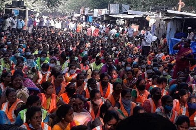 Nine months ago, the Greater Chennai Corporation (GCC) terminated the jobs of 560 contract conservancy workers — without notice — during a pandemic. These workers, however, did not give up. For the past nine months, they have been fighting for fairness from the civic body. On Monday, September 13, the group protested on the Marina beach, demanding their jobs back or adequate compensation. Many of them who lost their jobs had worked during the first wave of COVID-19 infections in 2020, and 90% of them were women.
