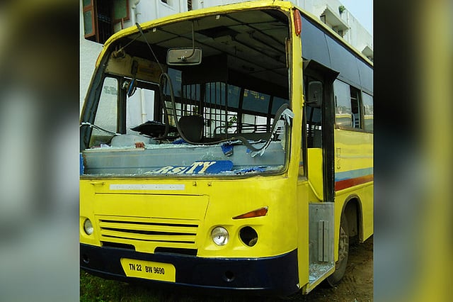 When asked about the extent of damage caused, he says, "Building have not sustained any damage due to fire. They only burnt mattresses. Windows of classrooms, the library and buses have all been shattered."