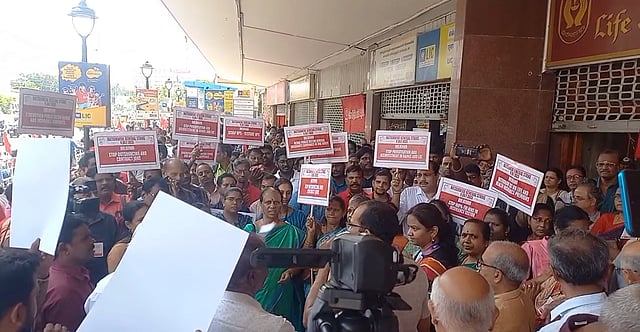 Bank employees across Chennai staged a protest on Wednesday, July 9, as part of a nationwide strike called by ten central trade unions, excluding the Bharatiya Mazdoor Sangh affiliated with the Rashtriya Swayamsevak Sangh (RSS).